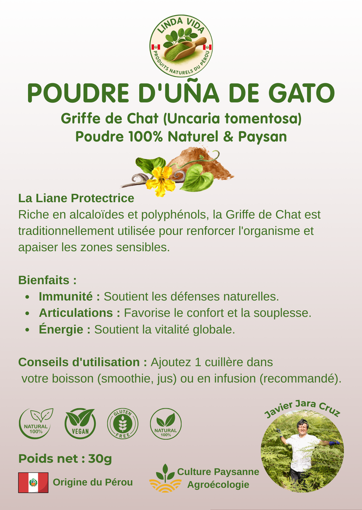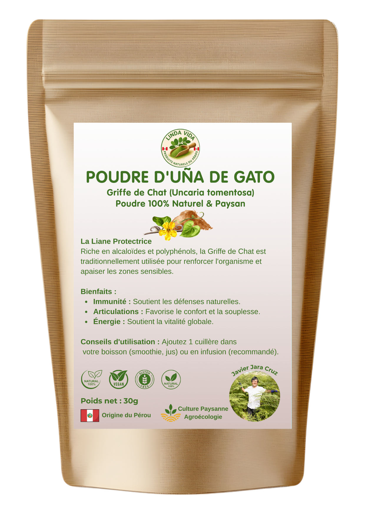 The sacred shield of the Amazon. The Uña de Gato ( Uncaria tomentosa ), or "Cat's Claw," is a wild vine from the Peruvian forests. Revered for 2,000 years by the Ashaninka people, it is now recognized worldwide for its exceptional ability to support the body's natural defenses and maintain joint flexibility.