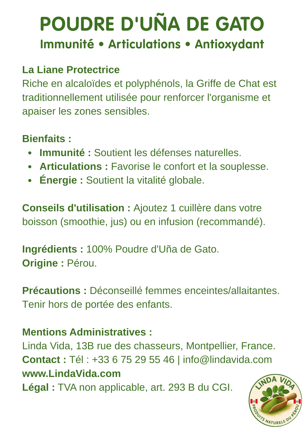 - Ingredient: 100% Inner bark powder of Uncaria tomentosa (Cat's Eye). (No additives • 100% Plant-based).